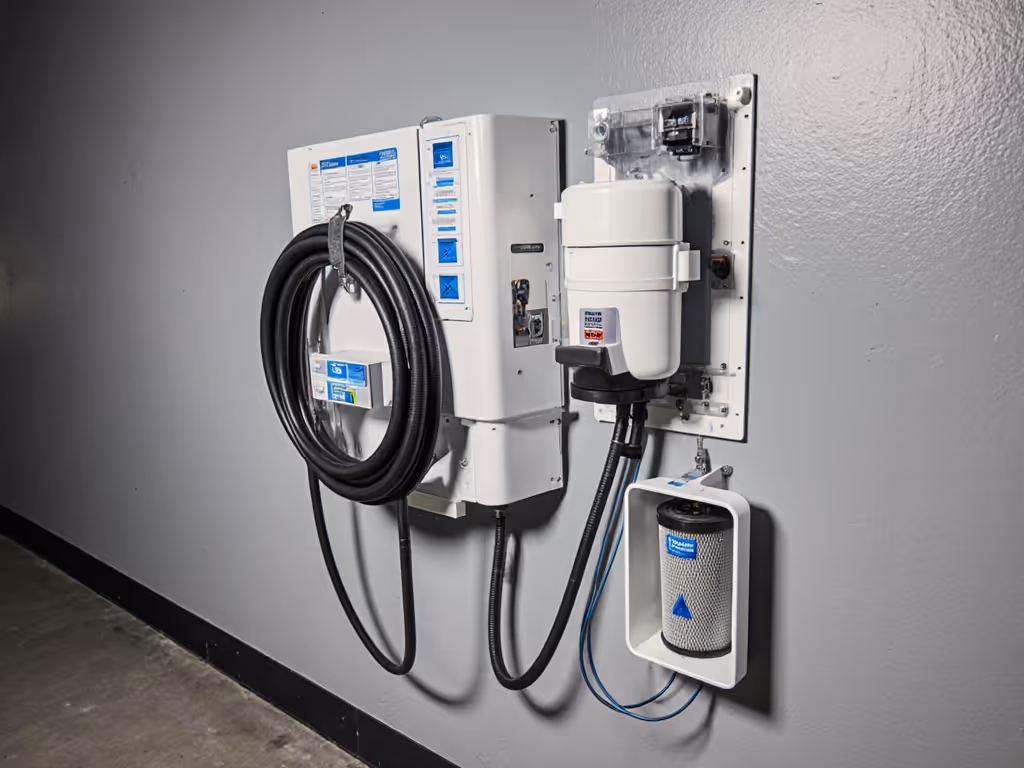 Fail here, and you're not just losing space, you're creating a documented exposure risk. A wall-mount shop vac system with labeled access points solves this: casters lock during work, yet the whole unit stays mobile for site transitions. For fewer kinks and better seals, compare rubber vs plastic hoses.